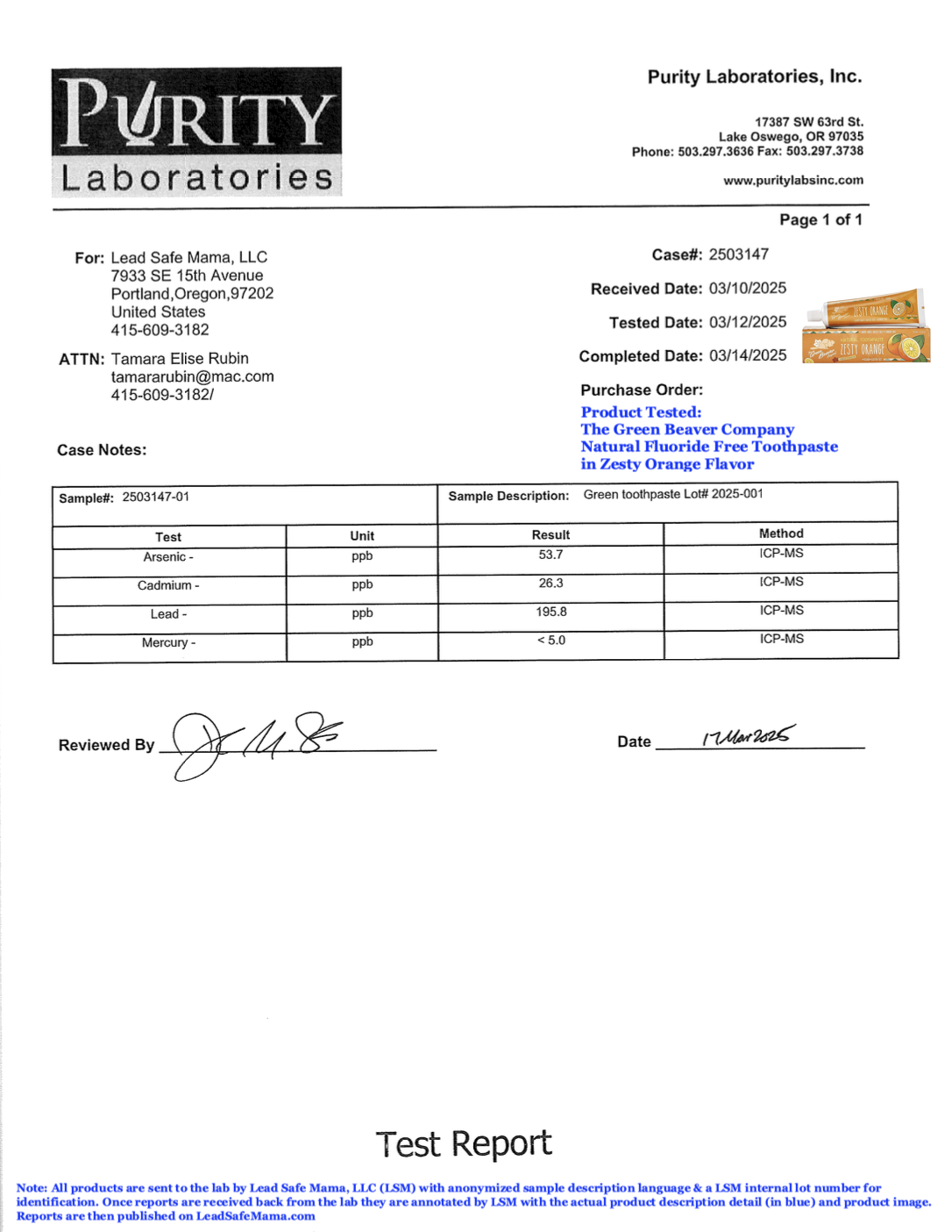 Lead Safe Mama, LLC - Green toothpaste Lot# 2025-001