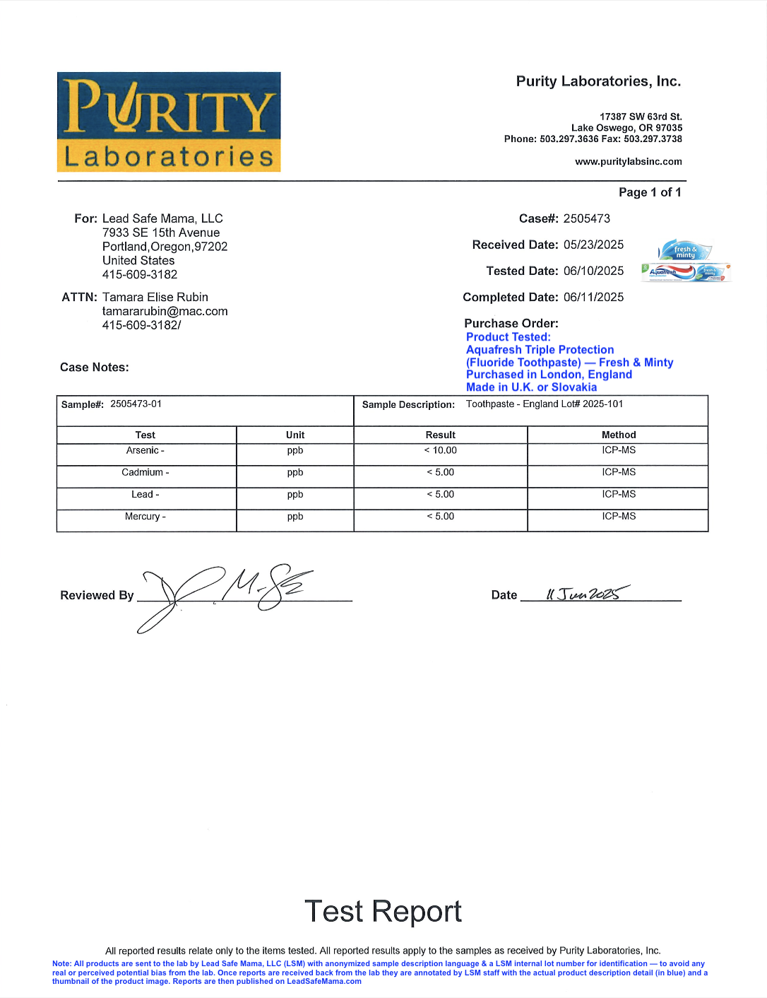 Lead Safe Mama, LLC - Toothpaste - England Lot# 2026-101 (Aquafresh Triple Protection Fluoride Toothpaste - Fresh & Minty Purchased in London, England Made in U.K. or Slovakia)