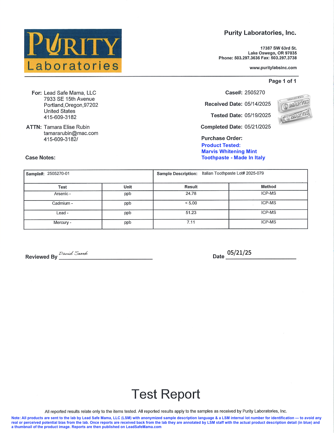 | Lead | 51.23 | ppb | detected | Legal: 0.015 ppb / Guideline: 0.0038 ppb |
