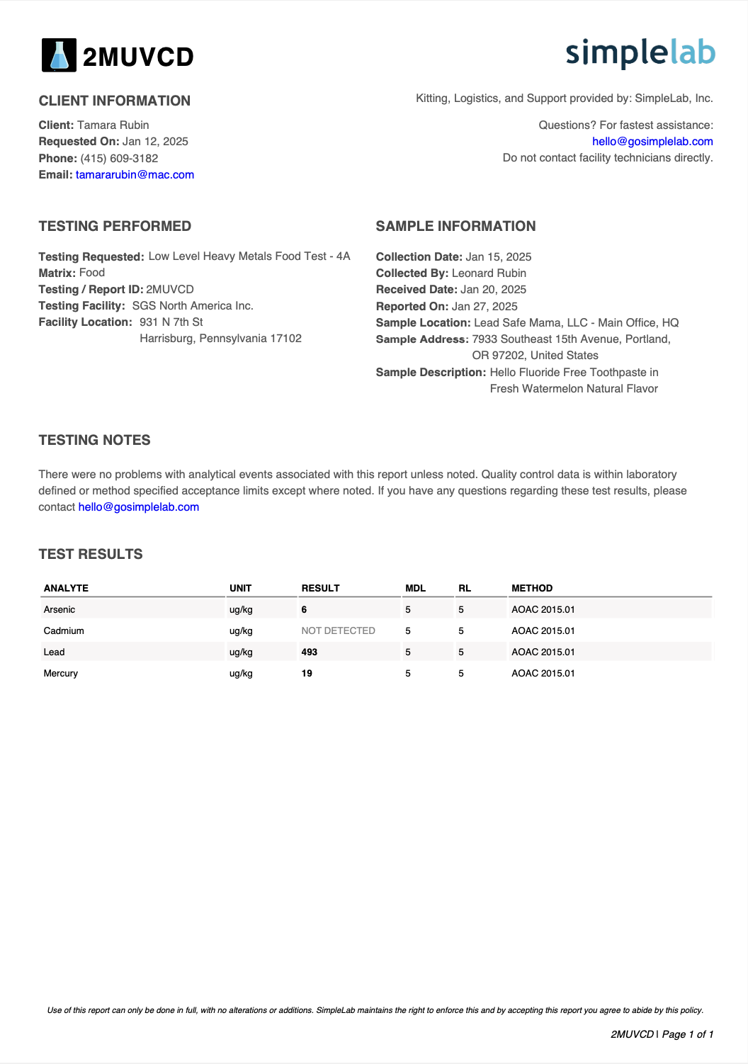 | Lead | 493 | ug/kg | detected | Legal: 0.015 ug/kg / Guideline: 0.0038 ug/kg |