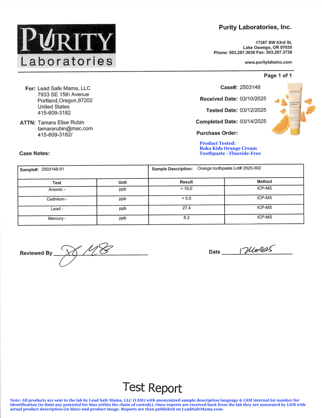 Lead Safe Mama, LLC - Orange toothpaste Lot# 2025-002