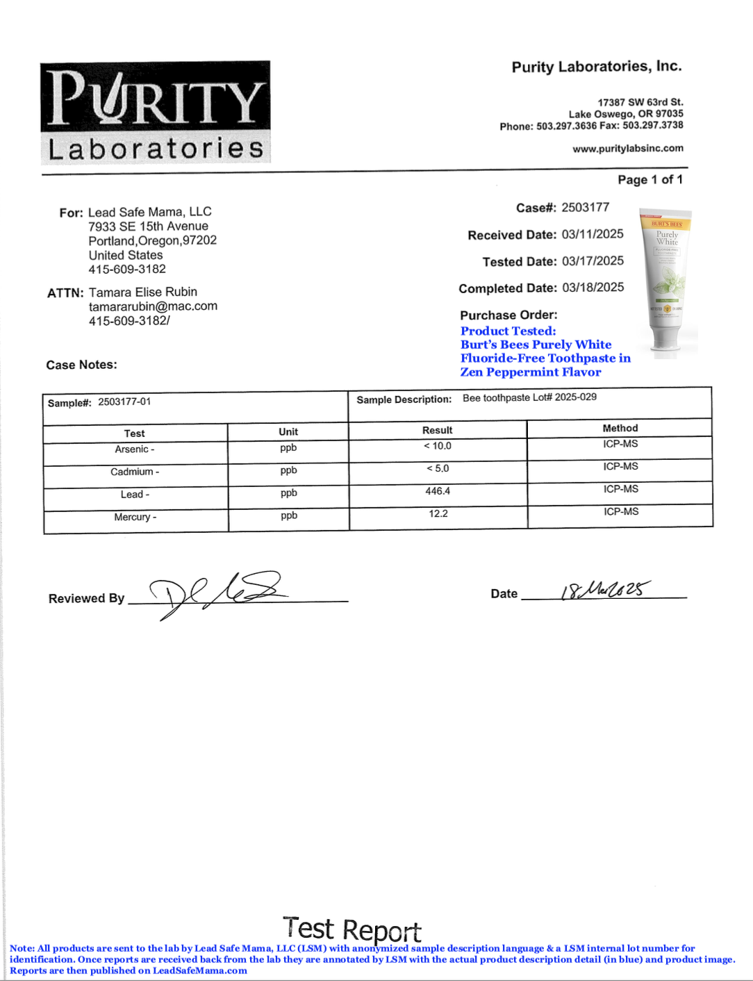Lead Safe Mama, LLC - Burt's Bees Purely White Fluoride-Free Toothpaste in Zen Peppermint Flavor