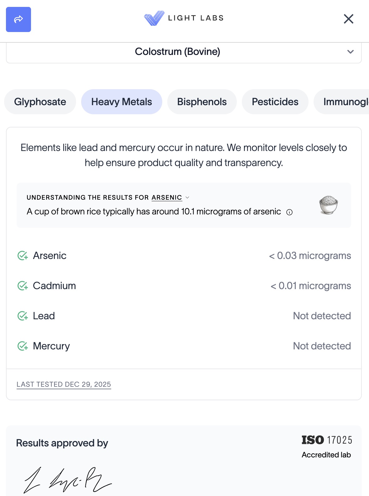 | Arsenic | — | micrograms | below detection | Legal: 0.01 micrograms / Guideline: 0.000004 micrograms |