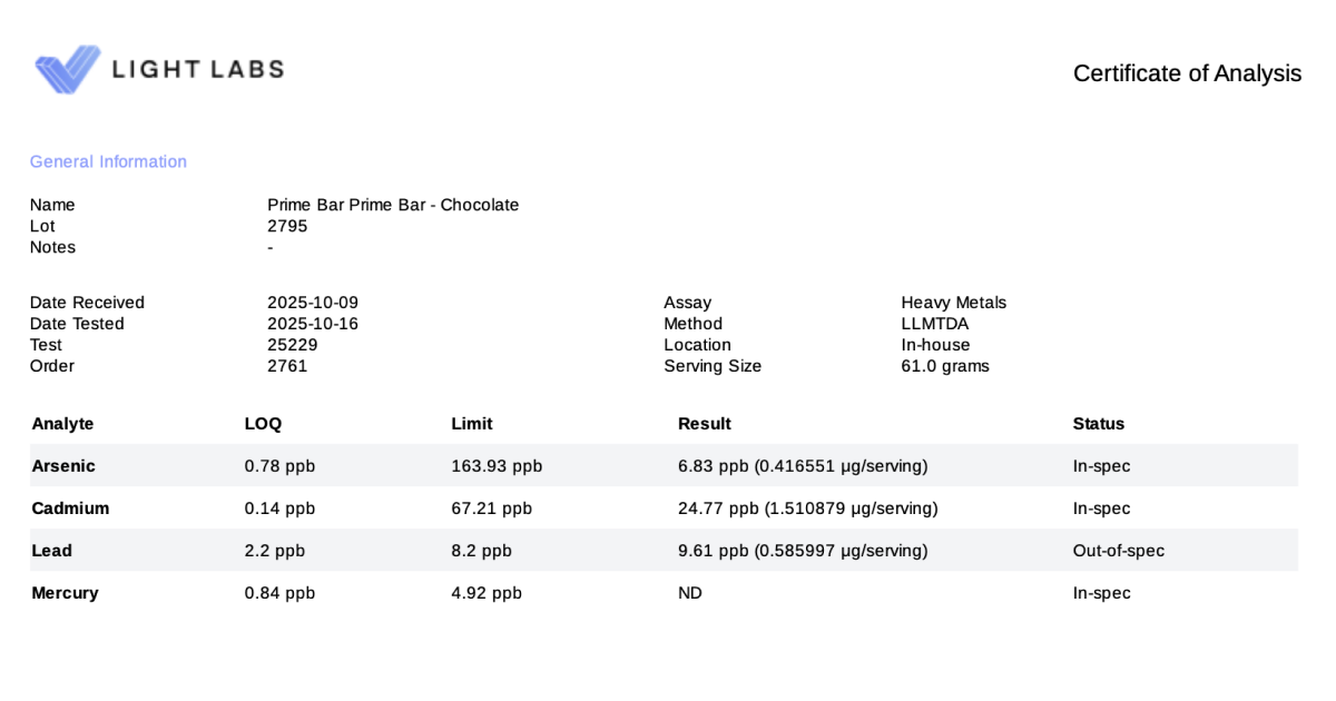 | Lead | 9.61 | ppb | exceeds legal limit | Legal: 8.2 ppb / Guideline: 0.0038 ppb |