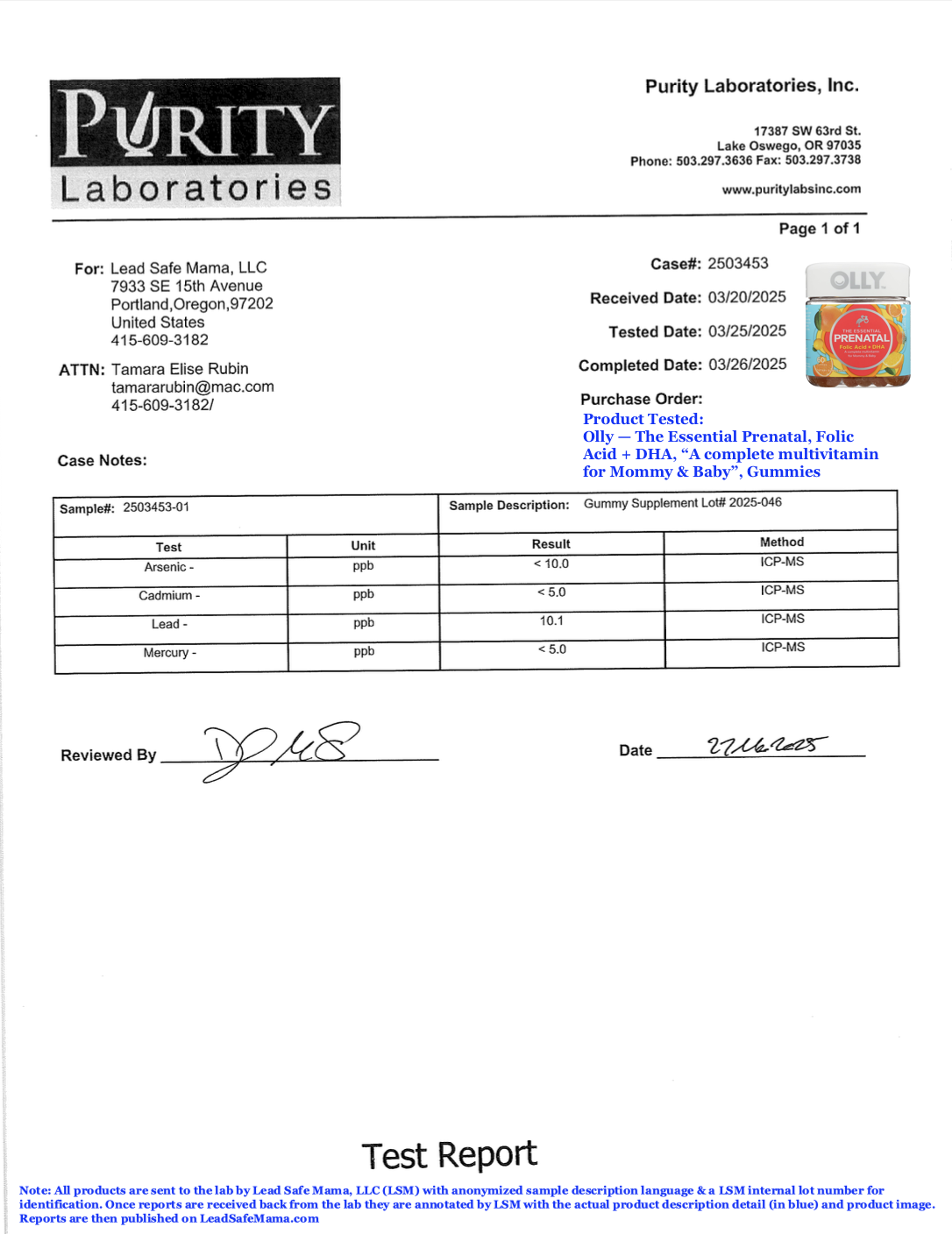 Lead Safe Mama, LLC - Gummy Supplement Lot# 2025-046 - Olly - The Essential Prenatal, Folic Acid + DHA, A complete multivitamin for Mommy & Baby, Gummies