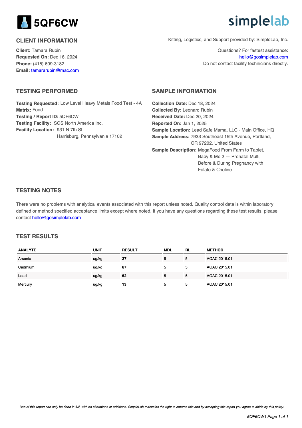| Lead | 62 | ppb | detected | Legal: 0.015 ppb / Guideline: 0.0038 ppb |