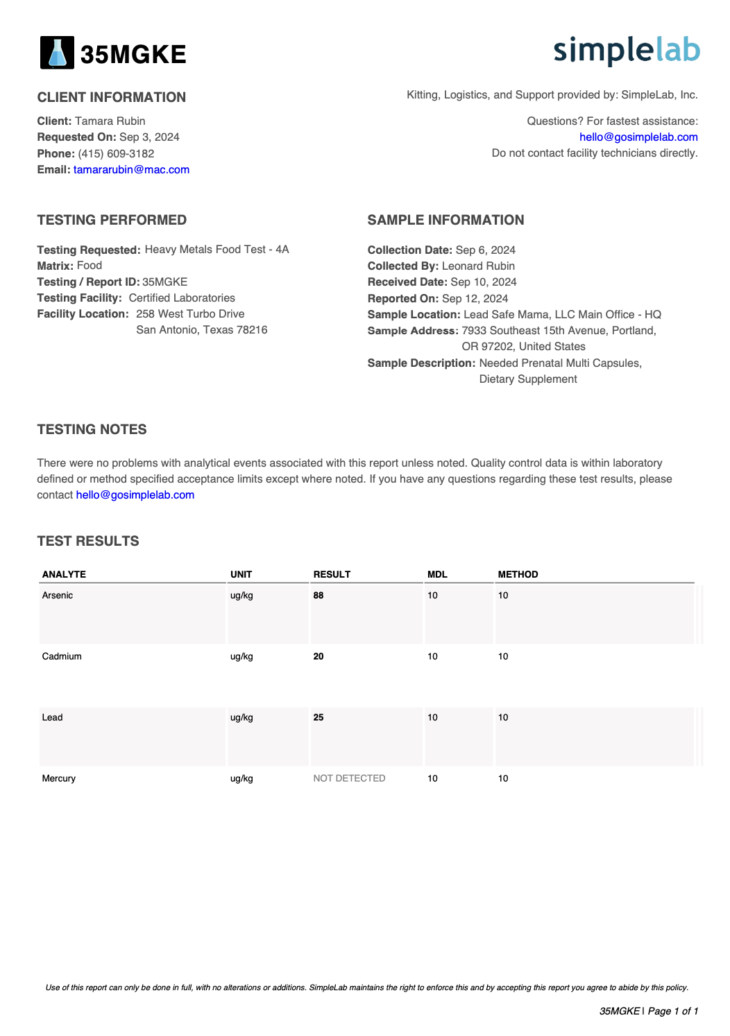 | Lead | 25 | ppb | detected | Legal: 0.015 ppb / Guideline: 0.0038 ppb |
