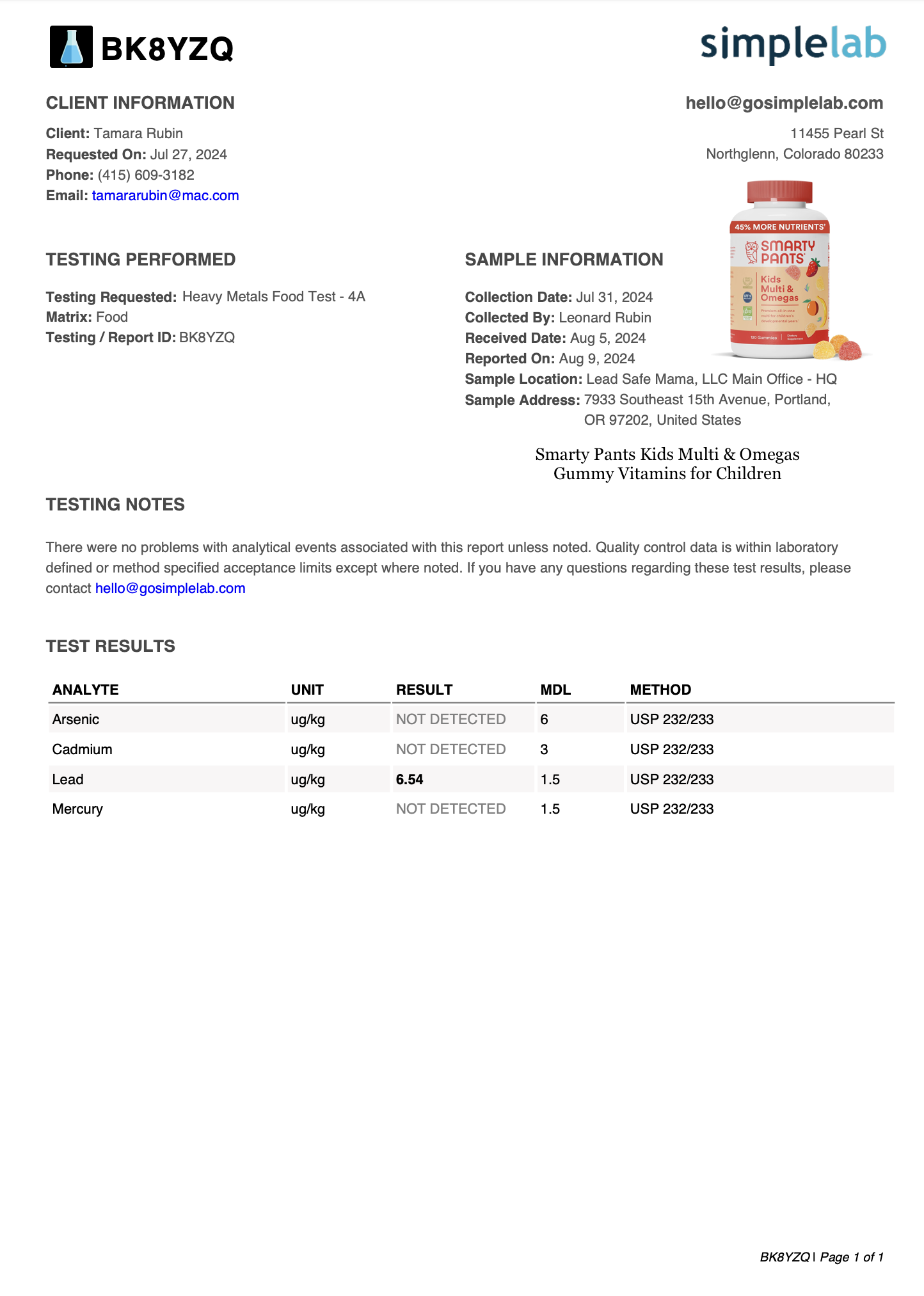 | Lead | 6.54 | ppb | detected | Legal: 0.015 ppb / Guideline: 0.0038 ppb |
