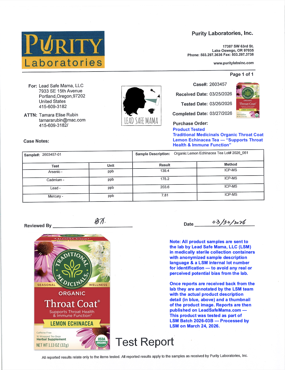 Lead Safe Mama, LLC - Organic Lemon Echinacea Tea Lot# 2026_061