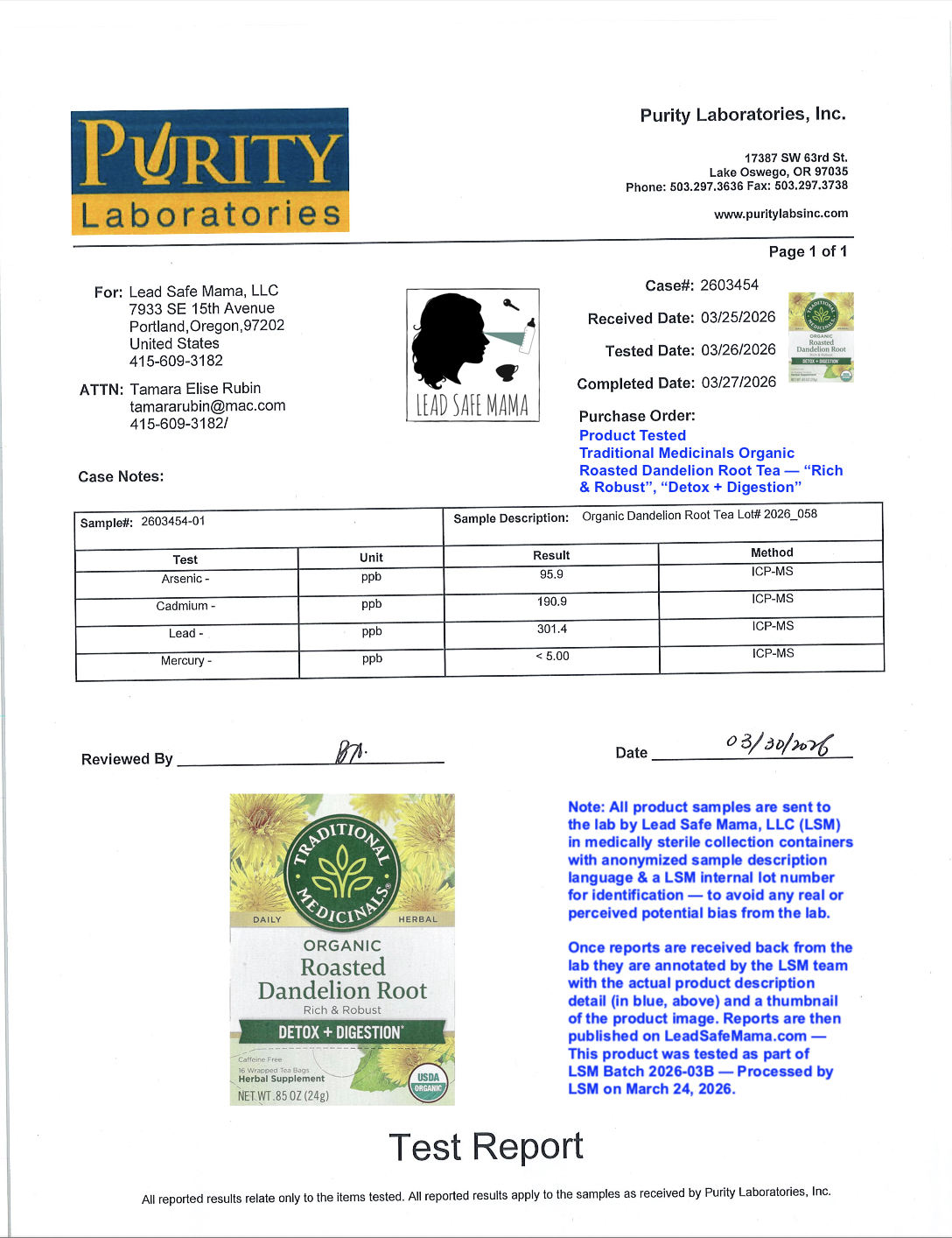 Lead Safe Mama, LLC - Organic Dandelion Root Tea Lot# 2026_058