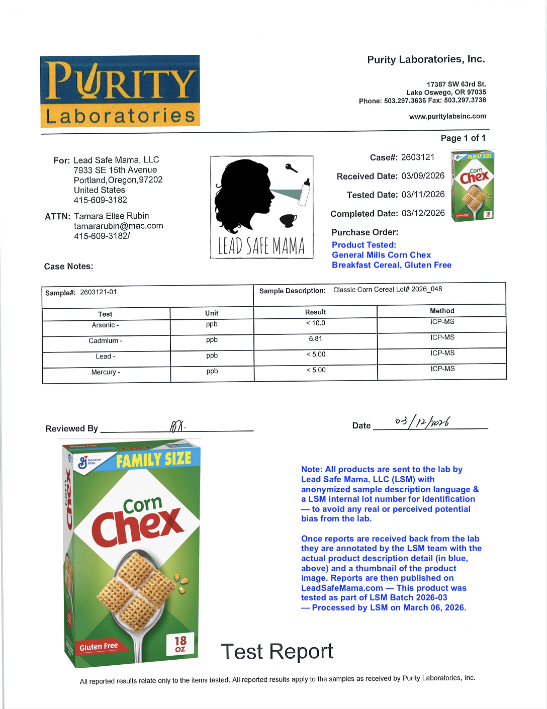 Lead Safe Mama, LLC - General Mills Corn Chex Breakfast Cereal, Gluten Free - Classic Corn Cereal Lot# 2026_048